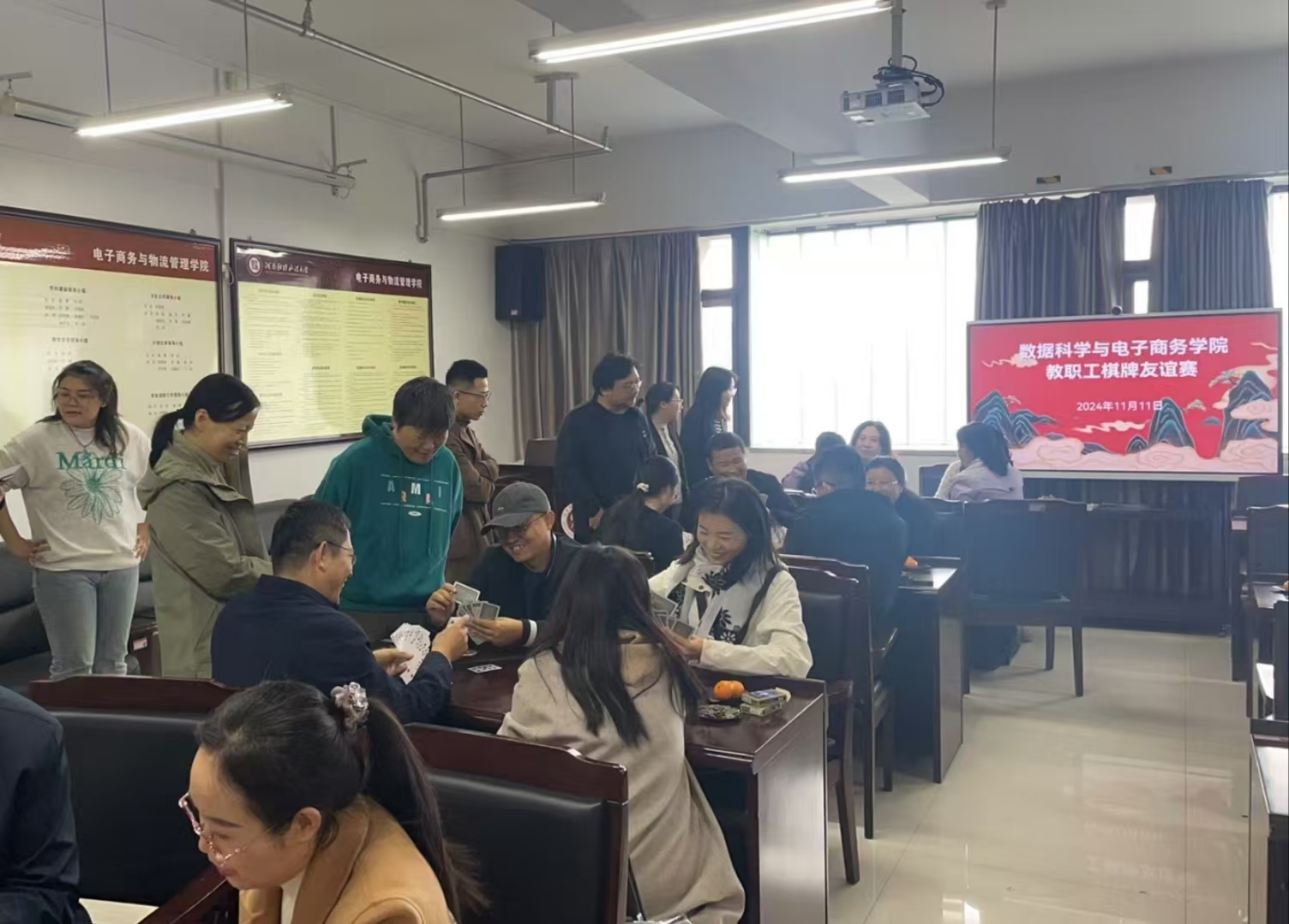 11月11日下午,beat365亚洲体育在线官网在郑东新区教学科研楼A527会议室成功举办了一场别开生面的教职工棋牌友谊赛,旨在丰富教职工的校园文化生活,增进教职工之间的交流与互动。此次比赛吸引了众多棋牌爱好者积极参与,现场气氛热烈而欢乐。